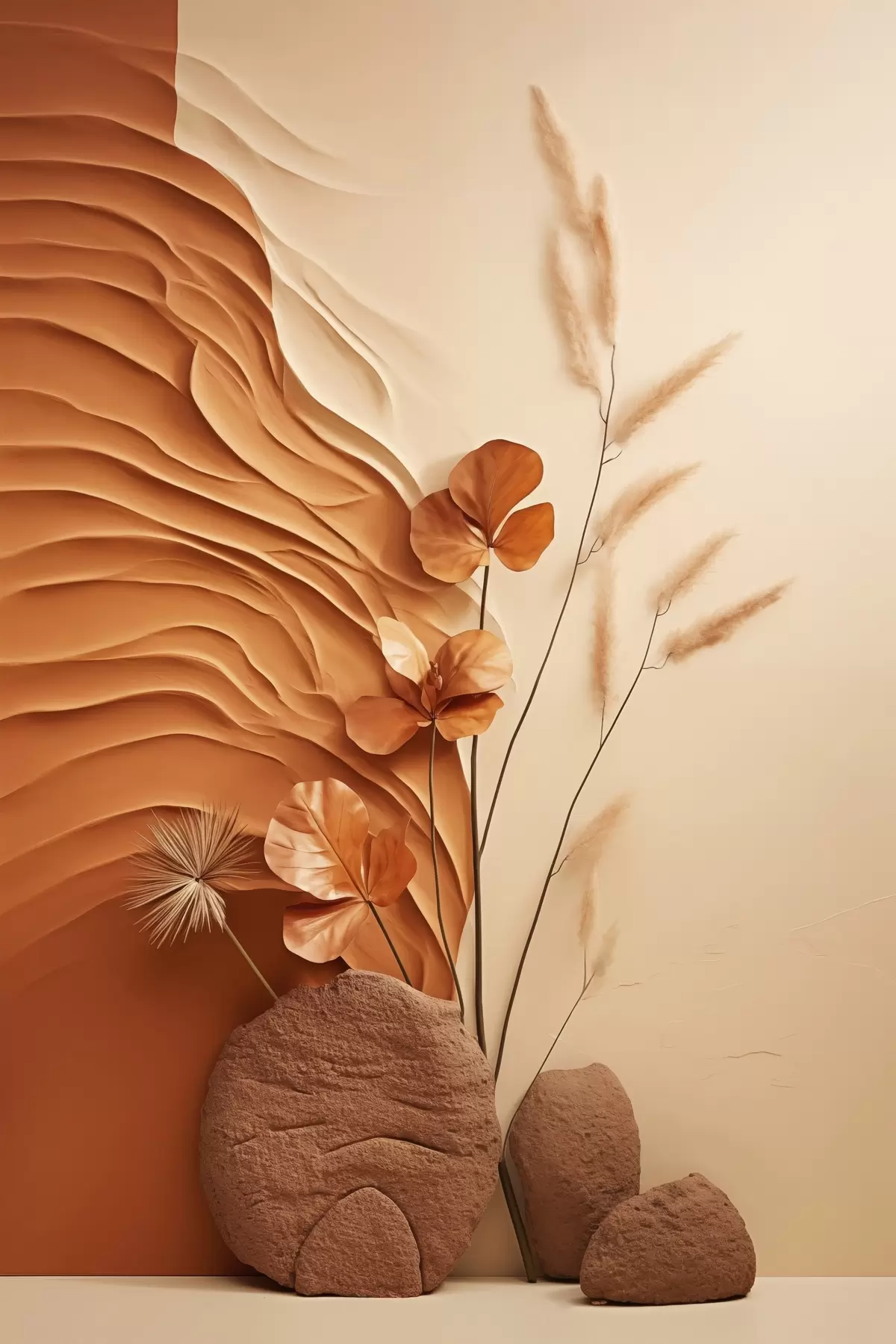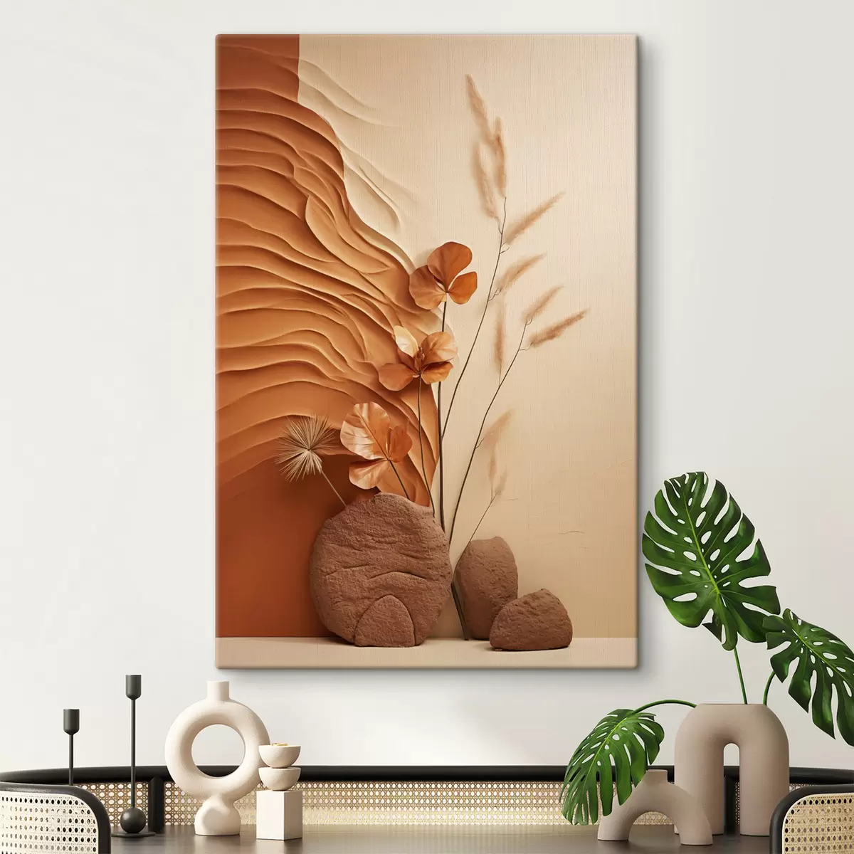 Schilderij Een minimalistisch kunstwerk met gedroogde bloemen en pampasgras, op een achtergrond met textuur Art. s48739