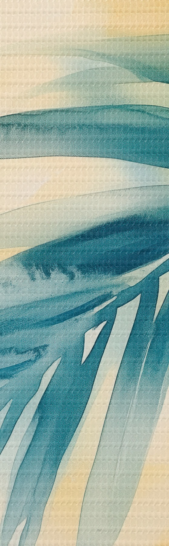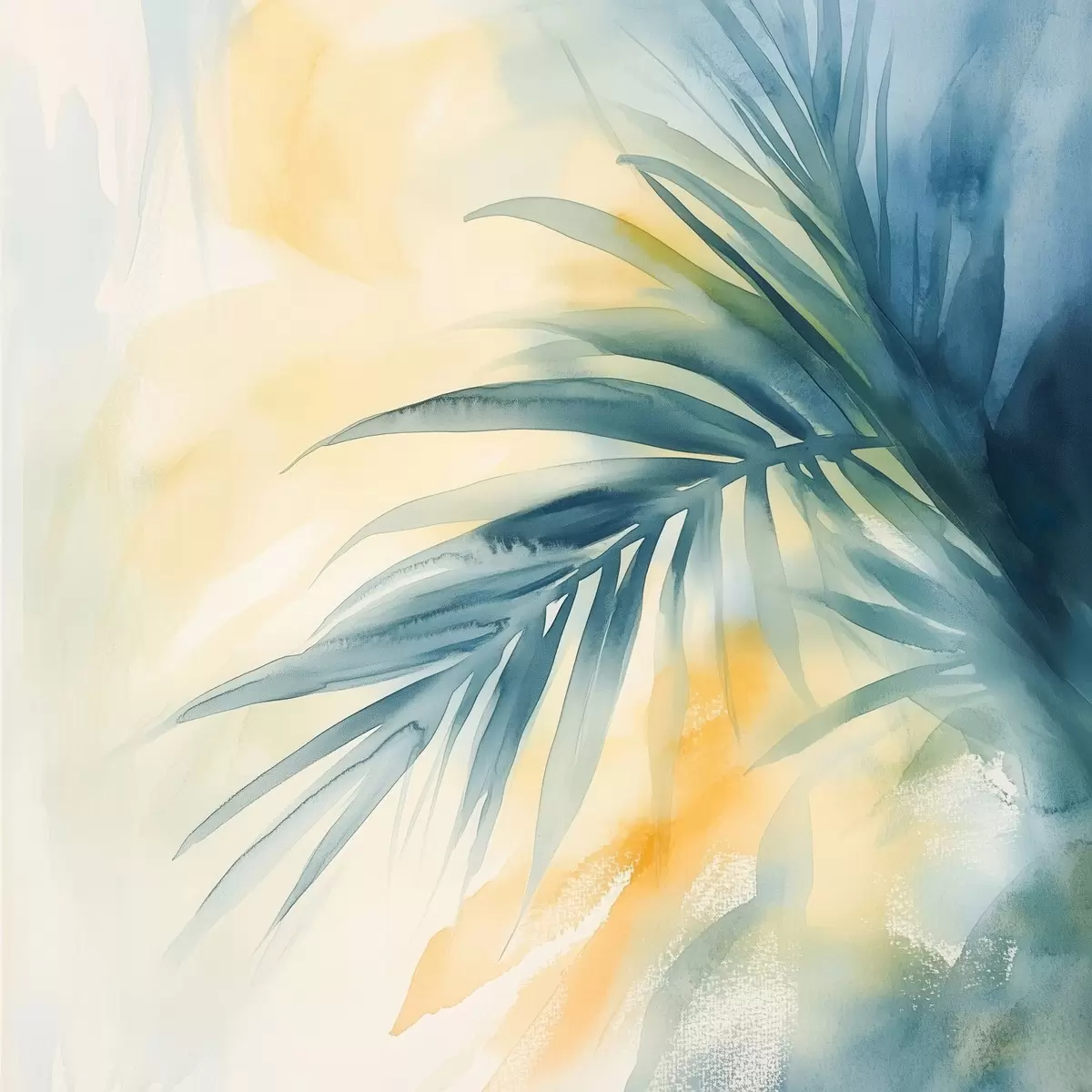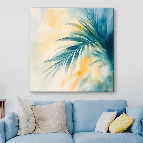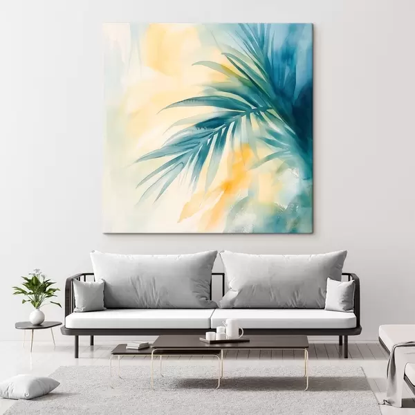 Schilderij Tropische palmbladeren in blauw-turquoise tinten tegen een achtergrond van warme aquarelvlekken Art. s48849